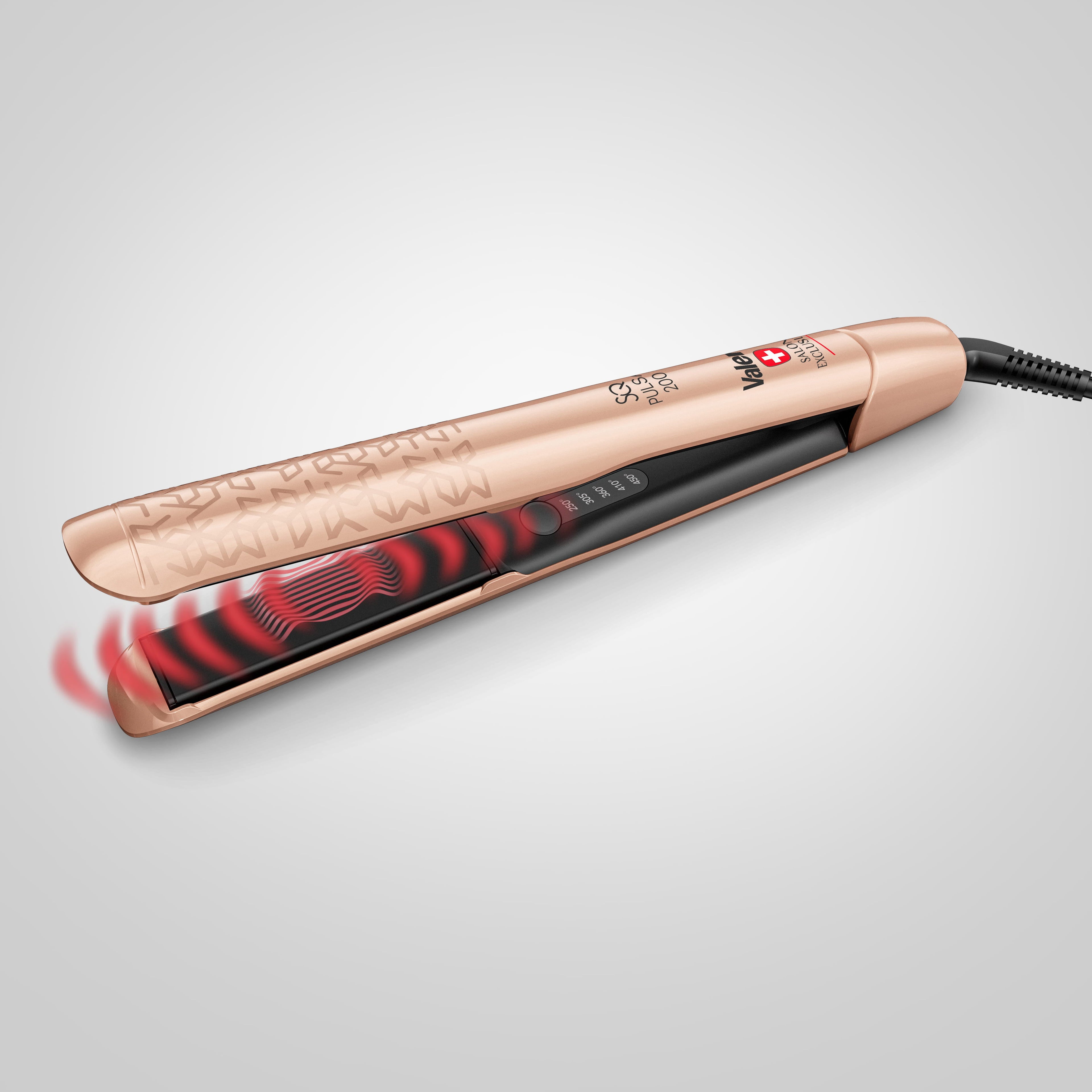 The SQ Pulsa 200 straightener guarantees intelligent styling and perfect results thanks to temperature control with special sensors. The temperature of the styling plates is measured 200 times per second. This maintains the set temperature and avoids fluctuations and overheating, no matter how thick the hair is and whether it is straightened or curled. The floating plate system provides full and uniform contact and the 5x ceramic coating with tourmaline promises an easier and healthier way to straighten. A high-performance ion generator releases negative ions consistently as you style. These protect the hair’s moisture content. For your safety and comfort, features include ultra-fast heat-up with memory function, a HOT indicator for the plates, auto shut-off after 60 minutes and 10 ft. long swivel cord insulated with heat-resistant rubber.