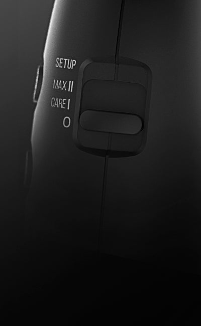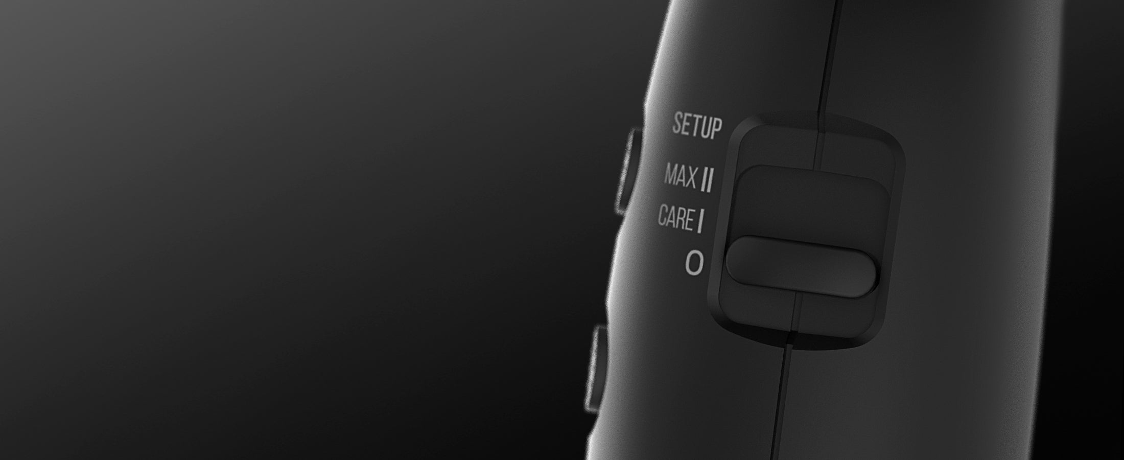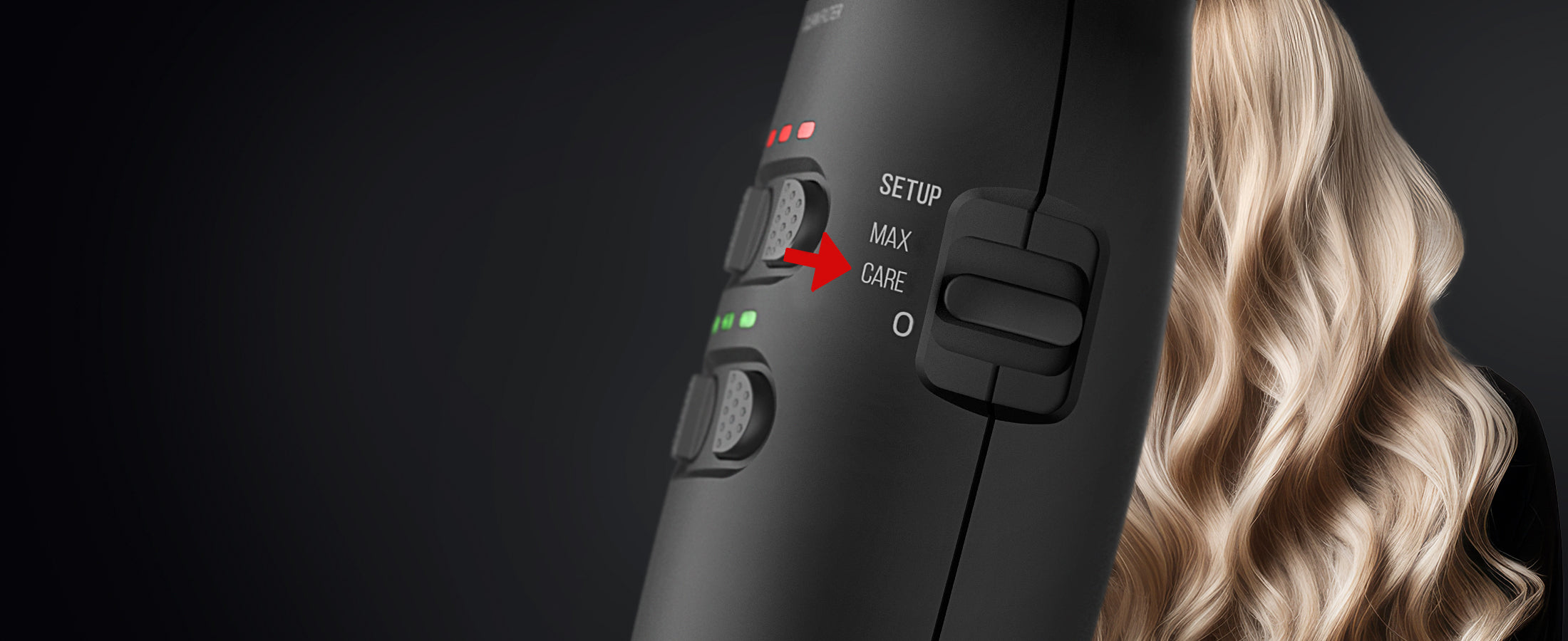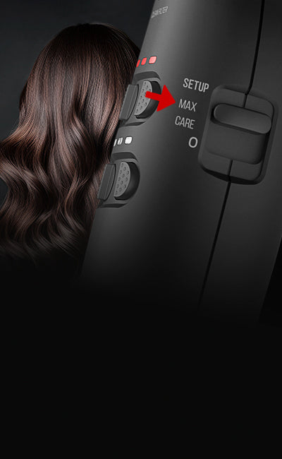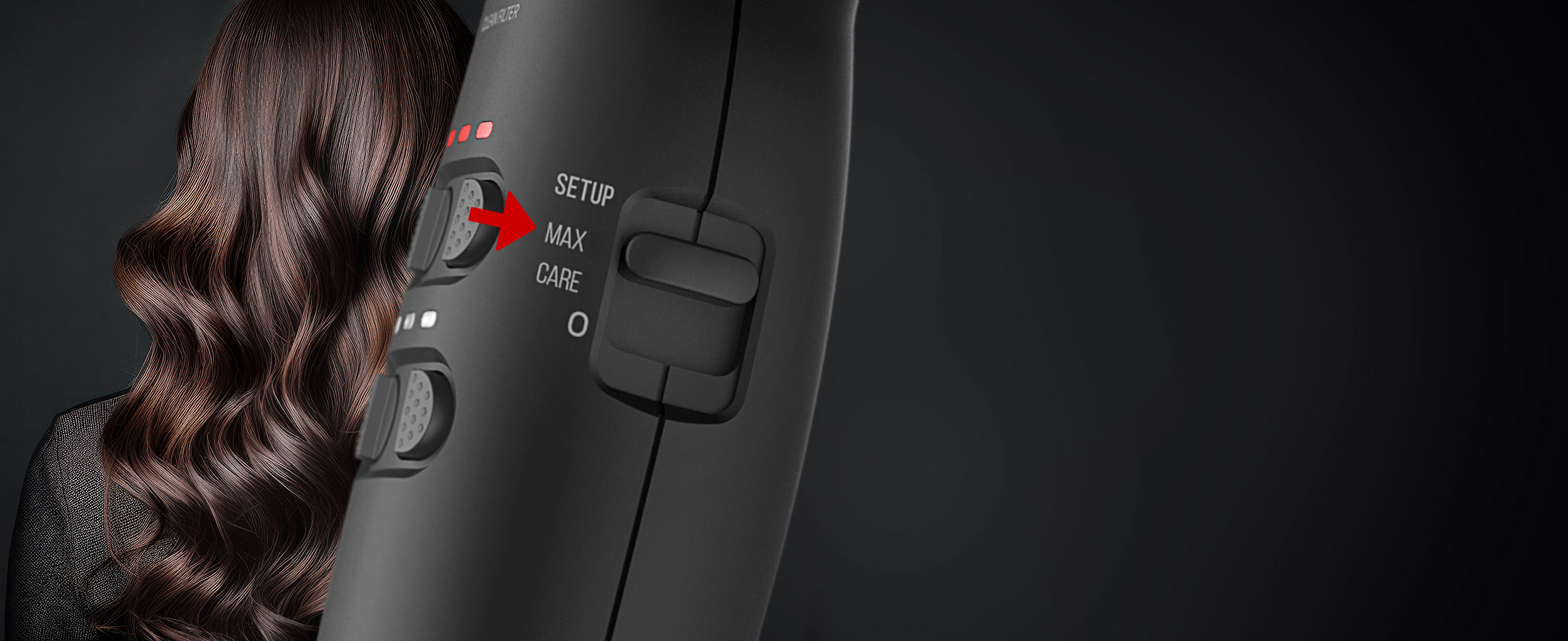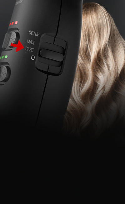 Choose the ideal setting for fine and delicate hair (Care) or thick and strong hair (Max).